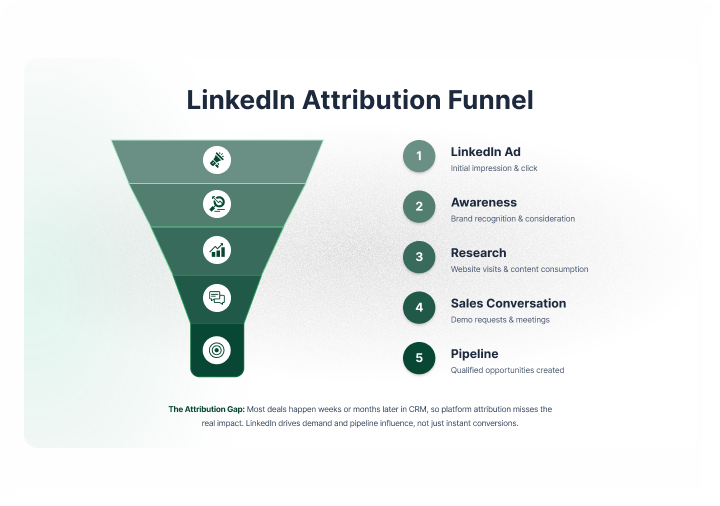 The companies that make it to your CRM through organic search, direct traffic, or a sales outreach — a significant chunk of them had already been touched by your LinkedIn ads. They'd seen your content. They recognized your brand. They were pre-sold before they ever typed your URL into a browser.